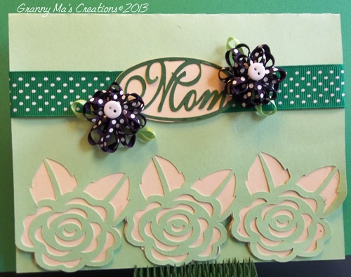 Carolyn from GRANNY MA's CREATIVE BLOG will be presenting this card to her granddaughter when she gets married this summer. She says: "To create this card I used the "Wedding Cake Card" cut file from Creative Pointe and a file from the silhouetteonlinestore.com by Lori Whitlock. I used cream color card stock for the card base. The silvery, glittery paper on the cake is from Michaels, as is the gray polka dot background paper used for the layering. The silhouette wedding couple are ones I created using my SCAL3 software, and will be available in my store. Small flowers are from the ribbon section of the sewing department of Wal-Mart. The pearls on each end of the card came from the $1.00 section at Michaels."